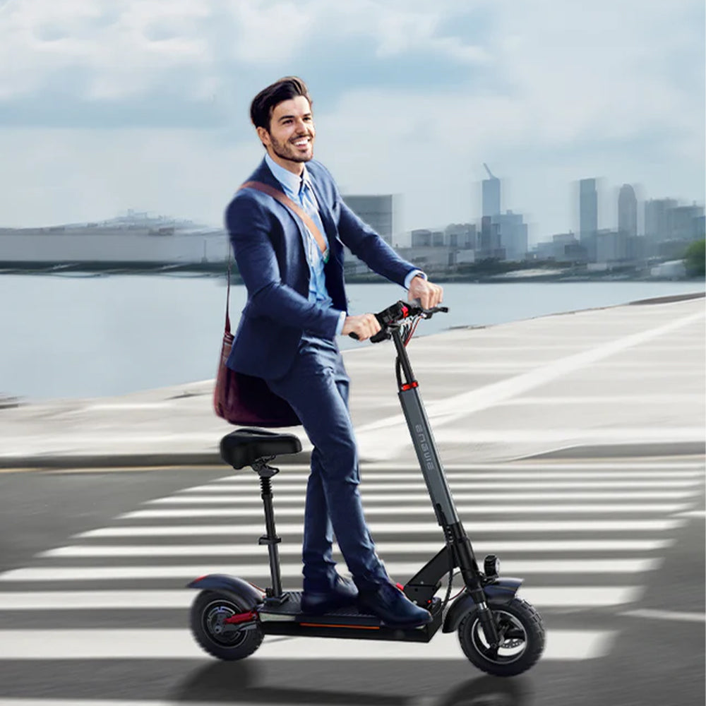 (4)Removable Seat + 3-Second Folding:Seat for comfortable cruising or foldable as a standing scooter – 9.05-inch deck + compact storage in the trunk.