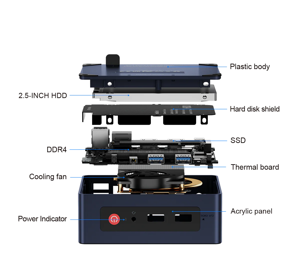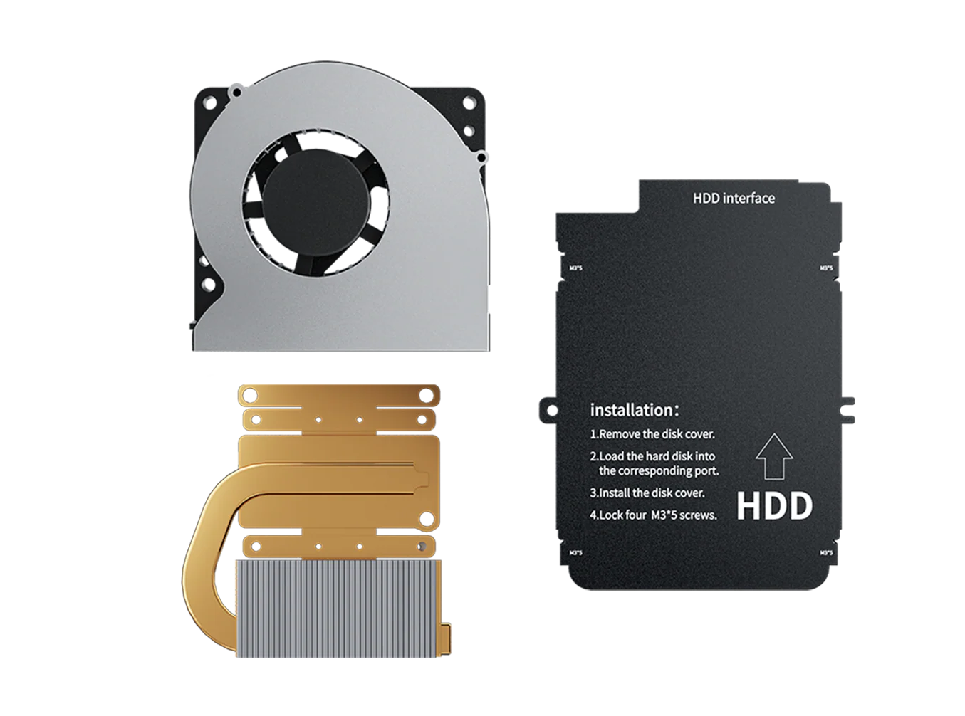 Cooling fan + Heat sink + Hard drive cooler work together to offer maximum cooling for the mini PC, taking the dry heat off its case, and lowering the temperature of its CPU while it is in operation.