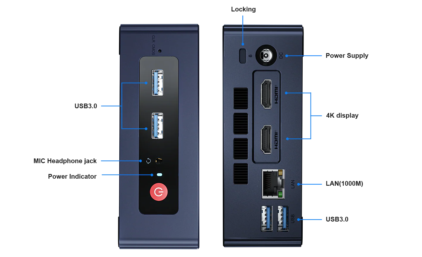(4)Comprehensive Connectivity:4x USB 3.0, 2x HDMI, Gigabit LAN, audio jack, and DC power input. Versatile interfaces support both office equipment and AV systems.