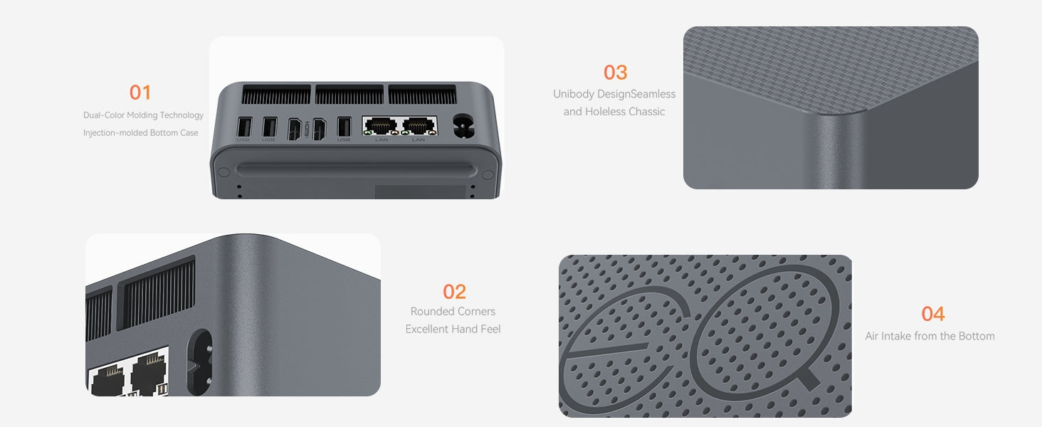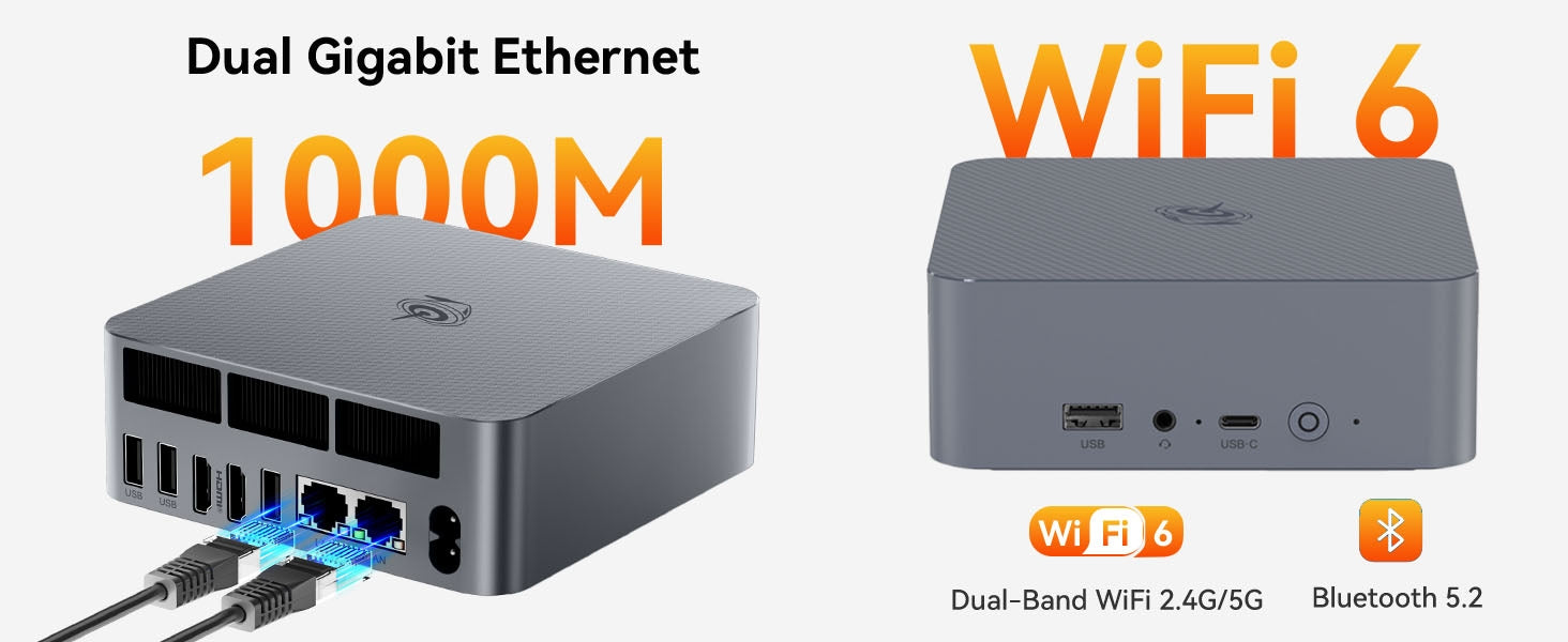 (4) WiFi 6 & Dual Gigabit LAN: WiFi 6 (up to 2.4Gbps) and dual Ethernet ports. Bluetooth 5.2 for stable connections.