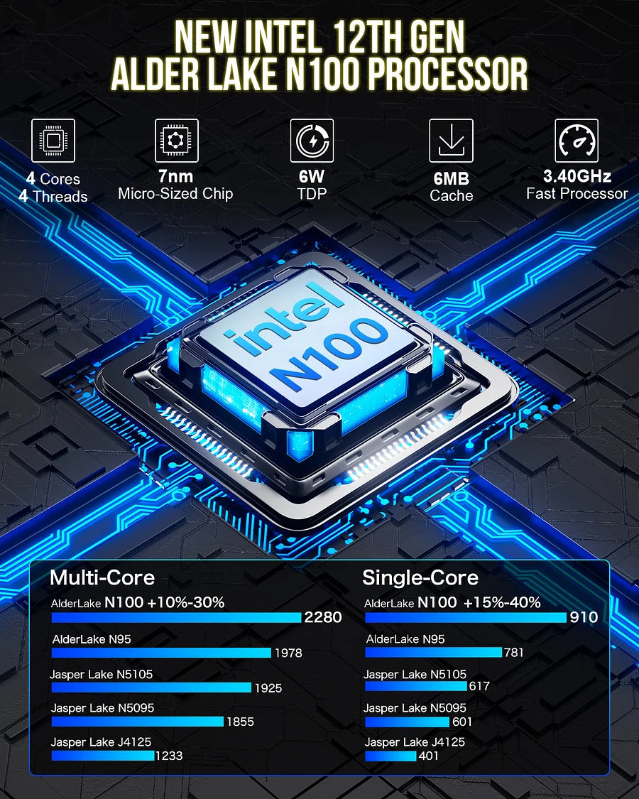 12th Gen N100 (up to 3.4GHz) uses 30% less power than N95, ideal for 24/7 tasks like NAS or digital signage.